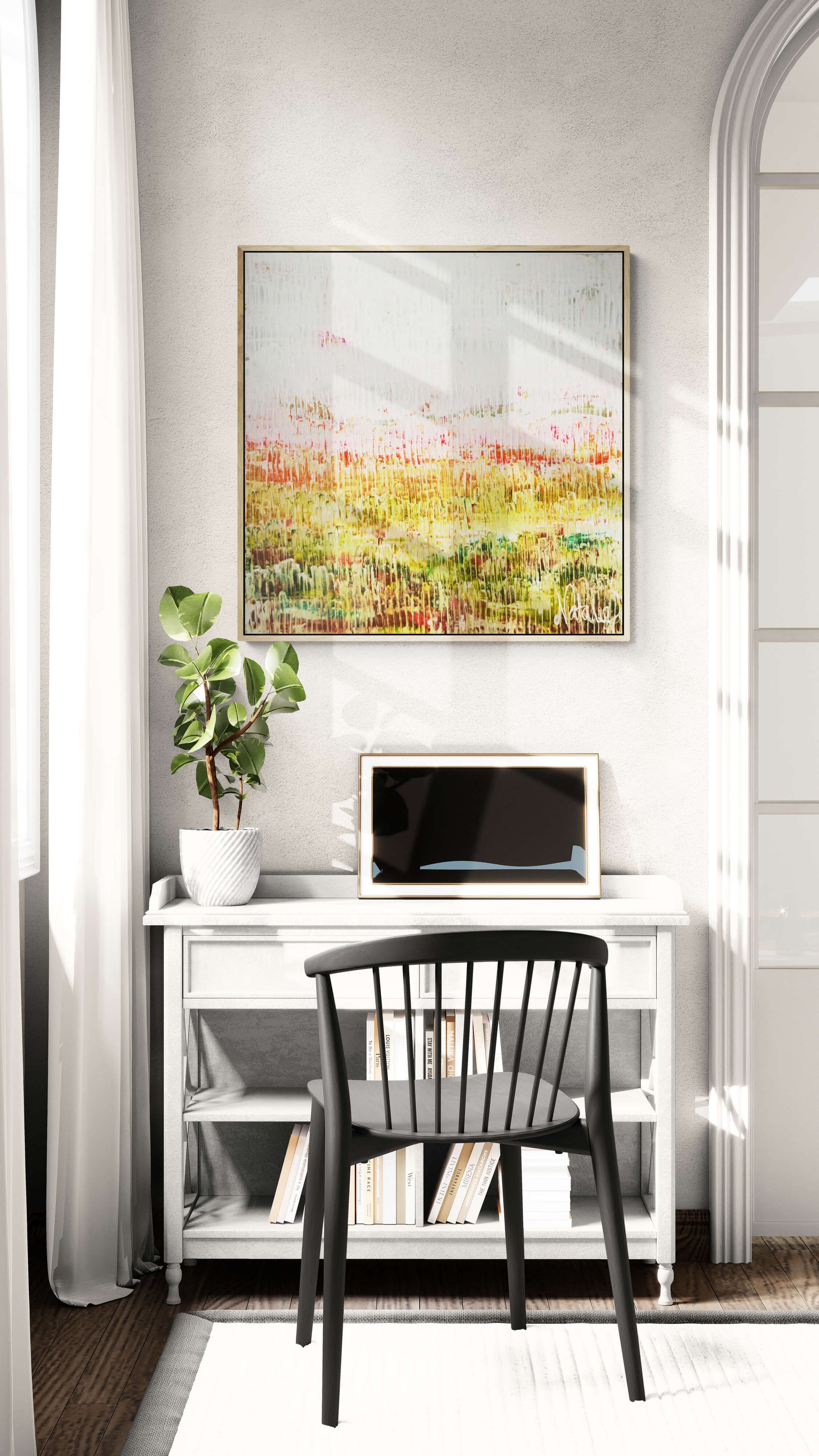 Bring Me Joy radiates lightness and optimism, with flowing layers that capture the essence of happiness and gratitude. The painting celebrates the simple yet profound energy of joy as it uplifts and renews.