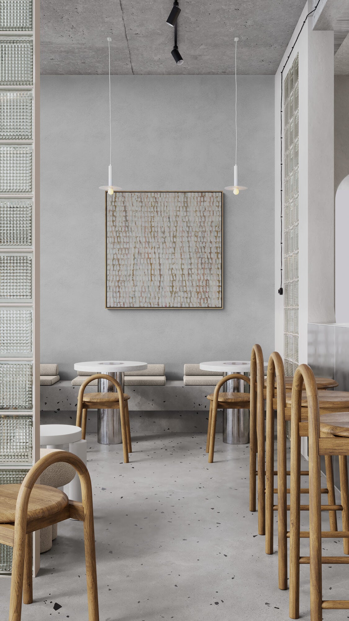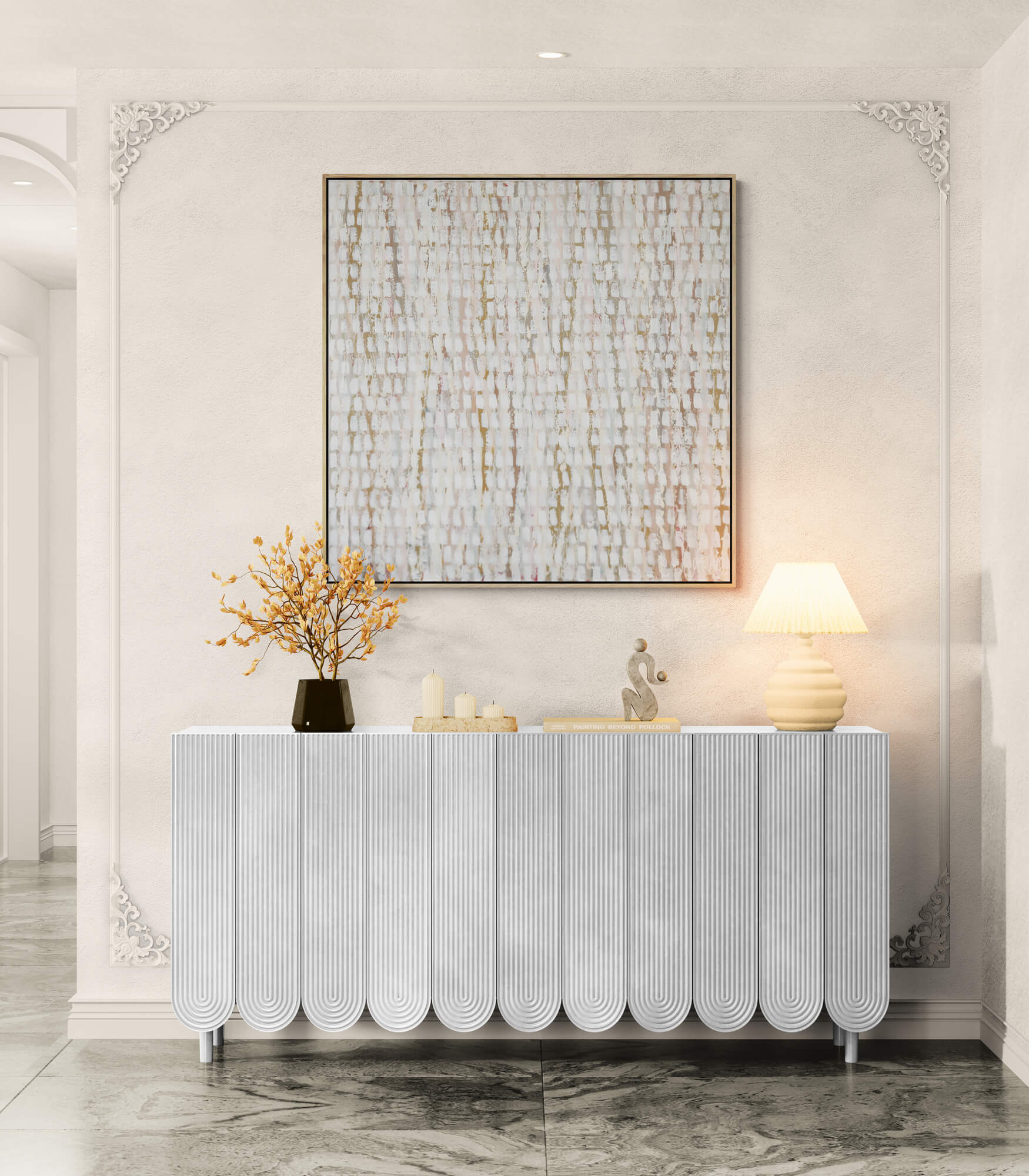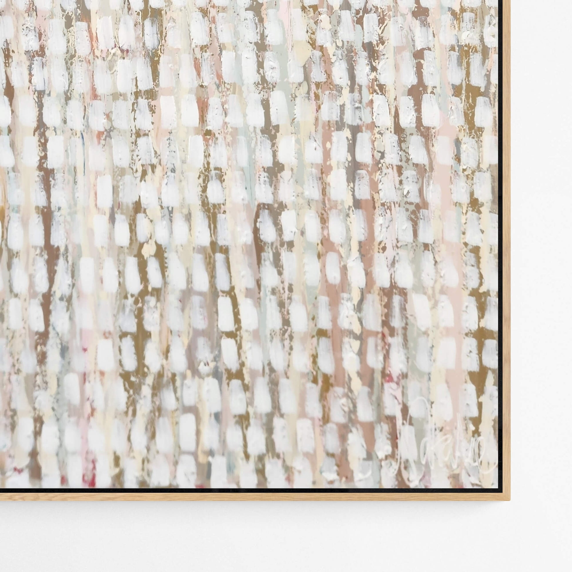 Fly Me to the Moon drifts through soft neutral tones, layered with delicate white lines that evoke movement, rhythm, and light. The gentle palette suggests calm and openness, while the flowing marks hint at dreams, connection, and the quiet pull toward something beyond.