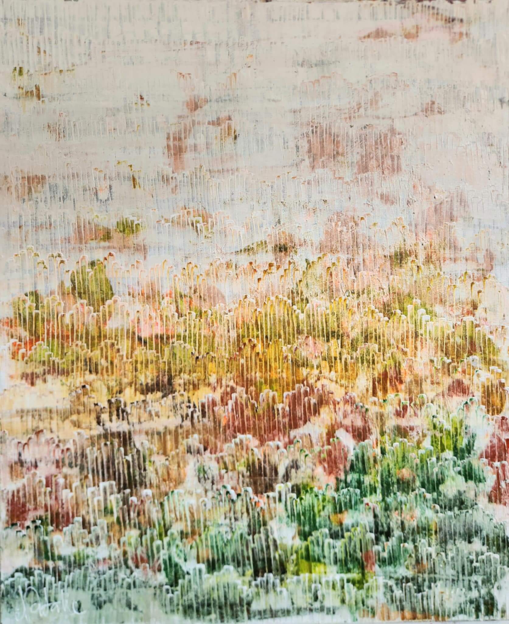 The Land Breaths evokes the gentle, expansive rhythm of nature coming alive. Earthy layers mingle with soft greens, creating a painting that feels alive yet serene — a living landscape held in quiet contemplation. The interplay of tones and textures suggests inhalation and exhalation, the subtle movement of energy across time and space.